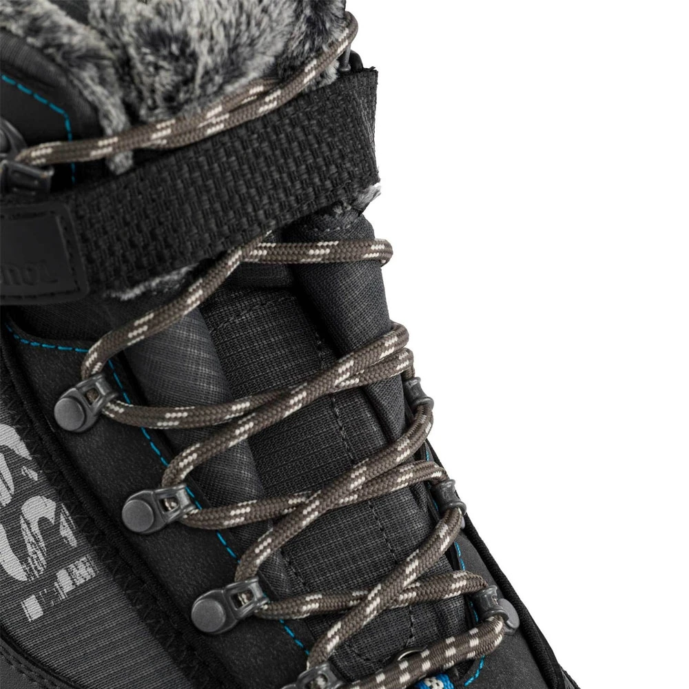 - Klassische Schnürung mit Metallhaken und Klettverschluss